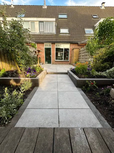 Eén van de redenen dat Mark en Charlot kozen voor Den Bleker was ook dat zij zelf de uitvoering in handen hadden. Er waren geen tussenpersonen bij betrokken en dat maakte de communicatie makkelijker. Op en aanmerkingen werden op deze manier snel opgelost. ‘Erg servicegericht’. Omdat de tuin aan het water ligt, moesten de tegels met een kraan over het huis gezet worden. Ook dit was goed georganiseerd. Er is veel bewondering voor de stratenmaker. Charlot: ‘Hij deed alles zelf! We hebben een aantal keer gevraagd of wij moesten helpen, maar het was niet nodig. Ik moest daar zelf erg om lachen.’ Mark: ‘Het was een goede, harder werker’. Alles ging ook super snel. De overkapping stond binnen een week en de tegels waren met 3-4 dagen gedaan, ‘en dat helemaal in zijn eentje’ vertelt Mark. Ook over het verdere personeel waren ze erg tevreden. ‘Vriendelijk en beleefd’.