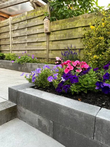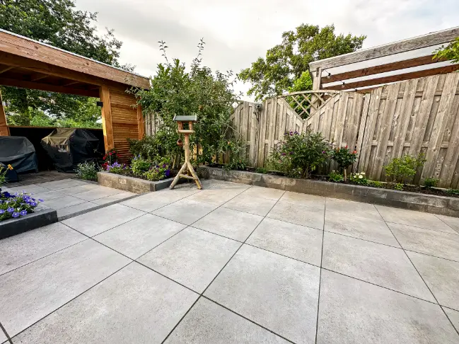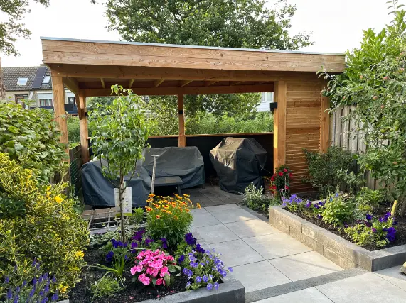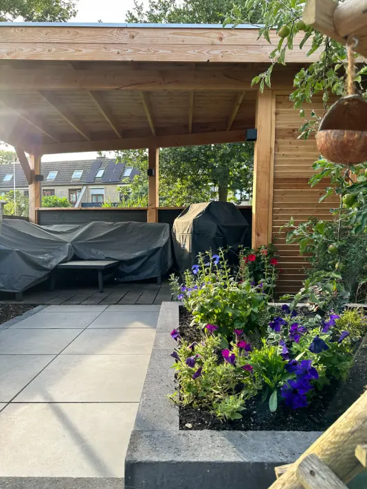 De overkapping, tegels en bloembakken zijn uiteindelijk gedaan door Den Bleker. ‘Alles ziet er mooi en strak uit, precies zoals we het gewenst hadden. We zijn er erg blij mee. Ik had het zelf niet zo goed gedaan.’ aldus Mark.